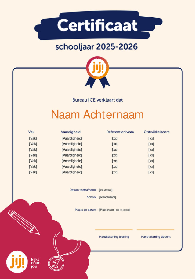 Wil je leerlingen een certificaat uitreiken na het afronden van een toets of het behalen van een streefniveau? Bekijk hieronder de JIJ! certificaten die je kunt downloaden als invulbare PDF.